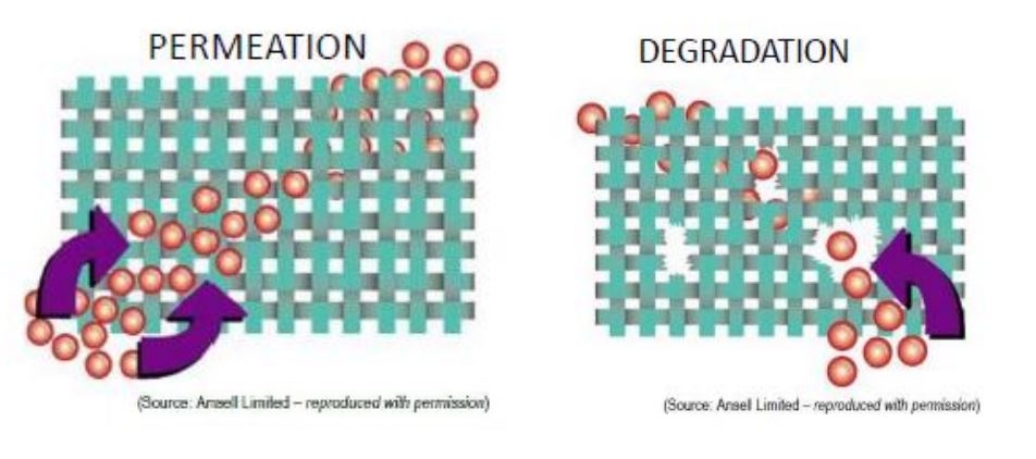 - Degradasi dimana ada perubahan yang merusak dalam satu atau lebih sifat fisik sarung tangan sebagai akibat dari kontak dengan bahan kimia. Perubahan ini termasuk pengelupasan, pembengkakan, disintegrasi, getas, perubahan warna, dimensi, penampilan, pengerasan, pelunakan dan lain-lain.